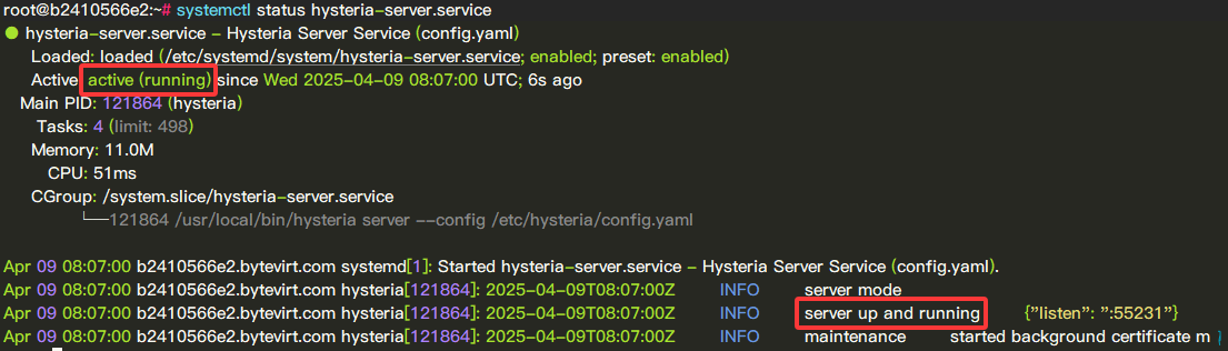 出现三行红字,分表表示hysteria2的文件路径、如何查看日志、设定自启动。