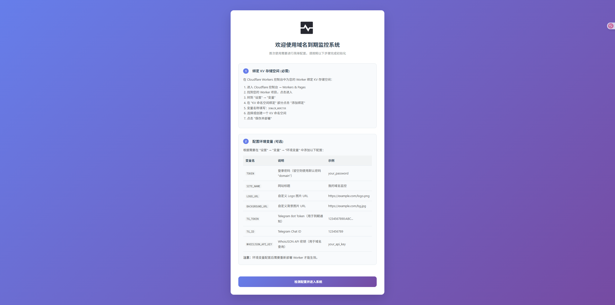 | SITE_NAME | 域名到期监控/Domain AutoCheck | ❌️ | 默认就是域名到期监控 |