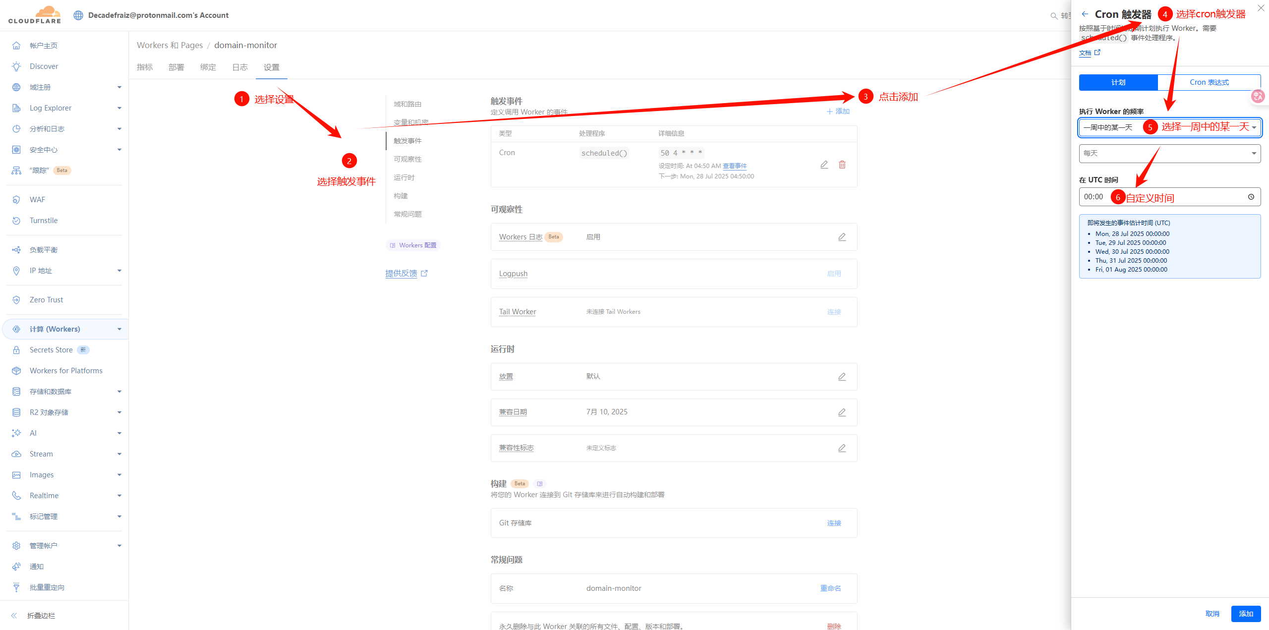 按照上述变量名添加完telegram变量后,点击设置——点击触发事件——点击添加——选择cron触发器——选择一周中的某一天——自定义时间