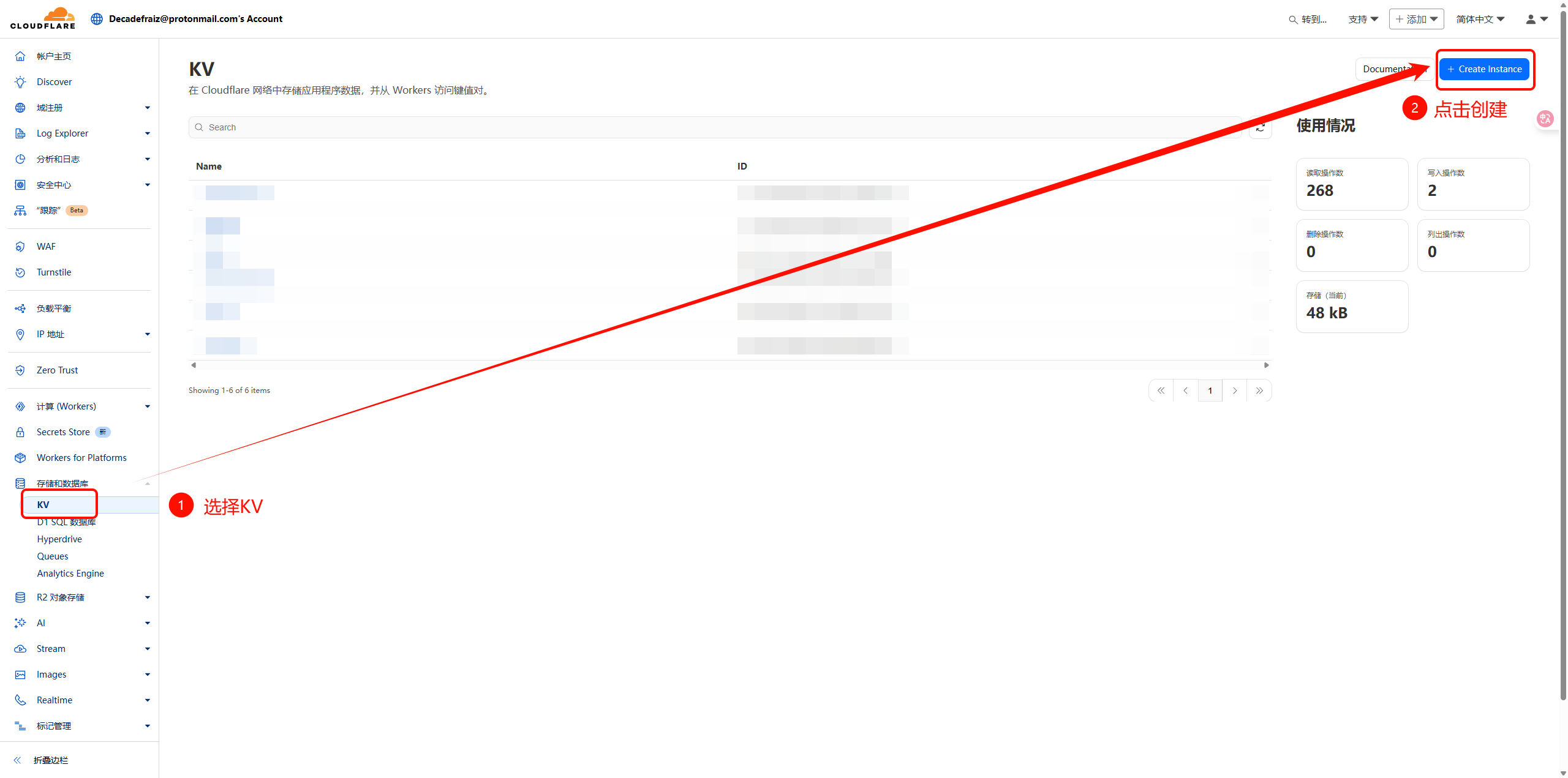 返回Cloudflare首页,点击左侧的存储和数据库,选择KV,点击右上角Create Instance,名字随便取自己认识就行,然后点击创建即可。